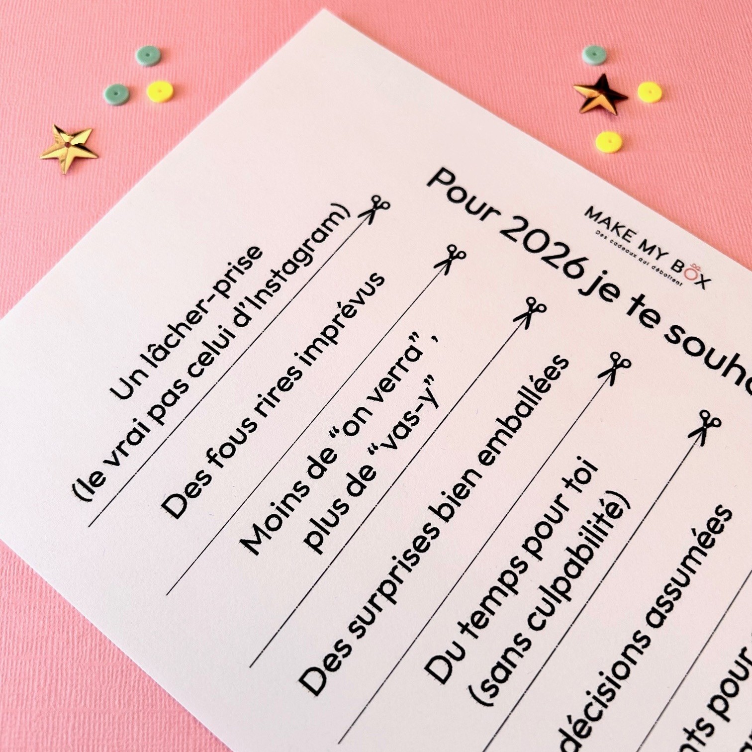 Tu peux donc écrire tes propres vœux, laisser écrire tes proches et découvrir ce qu’ils te souhaitent à travers leurs yeux. Petite idée pendant cette période de vacances : les écrire en famille, et voir comment ils vont se réaliser au cours de l’année.