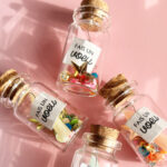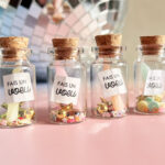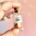 Cette fiole à voeux renferme un joyeux mélange de sequins, éléments brillants, étoiles et confettis, accompagné d’une petite bougie et du message : Fais un voeu.
