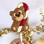 Ce petit ourson en chocolat au lait tient fièrement son sucre d’orge entre les bras, prêt à faire fondre petits et grands.